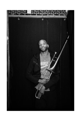 Trombone Shorty- Elevator portrait Love Rocks NYC rehearsals (Wed 3/6/24) Black & White Print